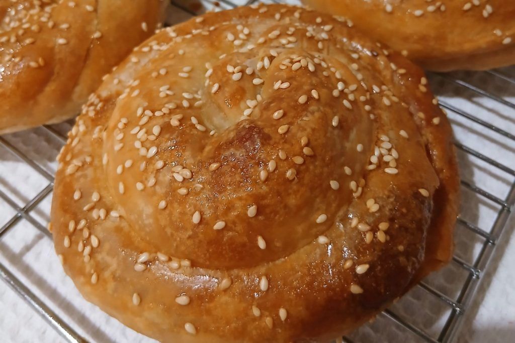 Ρολάρουμε όχι πολύ σφιχτά και κλείνουμε σε σαλιγκάρι. Επαναλαμβάνουμε την ίδια διαδικασία με τα υπόλοιπα πιτάκια και τα τοποθετούμε σε ένα ταψί με λαδόκολλα. Αλείφουμε με χτυπημένο αυγό και πασπαλίζουμε με σουσάμι. Ψήνουμε στους 190 βαθμούς Κελσίου μέχρι να ροδίσουν. Σας άρεσε αυτή η συνταγή; Πείτε μας την γνώμη σας στα σχόλια.