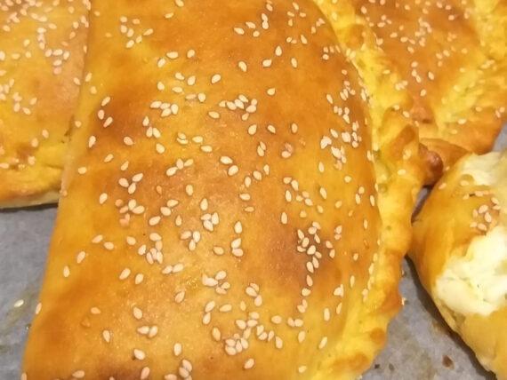 Σκεπάζουμε την ζύμη και την αφήνουμε να φουσκώσει για 45 λεπτά περίπου σε ζεστό μέρος. Κόβουμε την ζύμη σε μπαλάκια και ανοίγουμε το κάθε μπαλάκι με τον πλάστη σε φύλλο. Βάζουμε στο κάθε φύλλο χοντροκομμένη φέτα και κλείνουμε μισοφέγγαρο.
