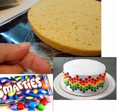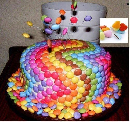 Για τον στολισμό θα χρειαστείτε σαντιγί, Smarties και ζαχαροπαστα . Φτιάξτε την τούρτα της αρεσκείας σας και καλύψτε την με ζαχαροπαστα σε οτο χρωμα θέλετε και στολίστε όπως στην φωτογραφία με Smarties και σαντιγί .