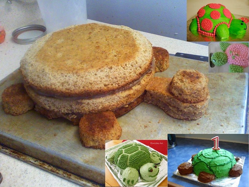 Φτιάξτε τα παντεσπάνια, αν πάλι θέλετε να γλιτώσετε χρόνο αγοράστε τα έτοιμα του σούπερ μάρκετ. Και αυτά κάνουν. Φτιάξτε μια δόση κέικ, ξέρετε αυτό το αφράτο που πετυχαίνετε πάντα, και φτιάξτε cup cakes. Ακολουθήστε τα βήματα για την κρέμα απο δω Συναρμολογήστε την τούρτα σας, όπως στην φωτογραφία. Παντεσπάνι, κρέμα, παντεσπάνι, κρέμα, παντεσπάνι. Βάλτε τα cup cakes για πόδια και κεφάλι. Αφού θα έχετε χτυπήσει την σαντιγί μοιράστε την σε 3 μπολ και χρωματίστε την. Αν προορίζετε την τούρτα για κοριτσάκι φτιάξτε και ροζ χρώμα. Για να έχετε 2 διαφορετικούς τόνους πράσινο χρώμα, αυξήστε τις σταγόνες. Οσο πιο πολλές τόσο πιο έντονο χρώμα. Αν πάλι θέλετε καφέ καβούκι, ρίξτε λίγο άγλυκο κακάο. Με ένα κορνέ φτιάξτε ένα από τα σχέδια της φωτογραφίας.