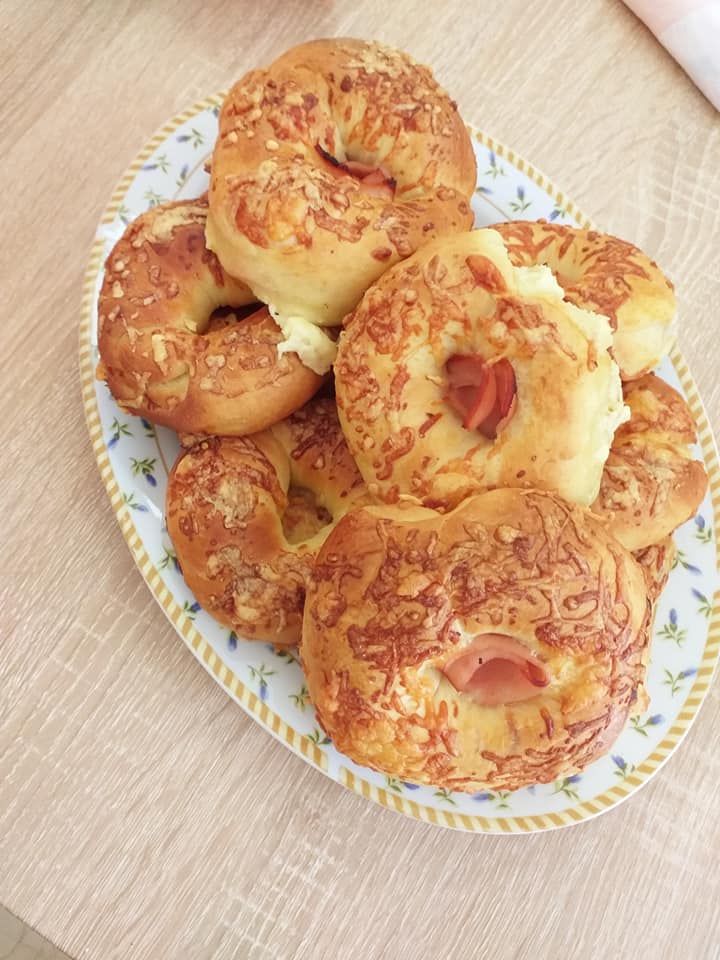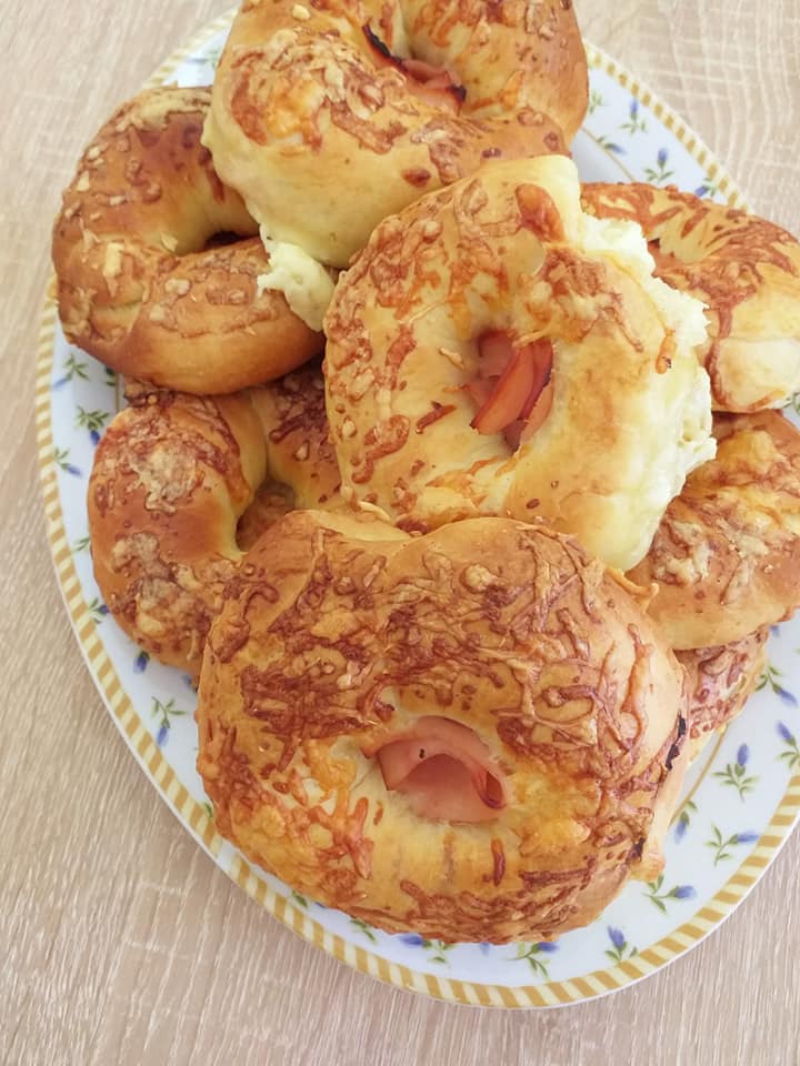 Έπειτα την μοιράζουμε σε μικρά μπαλάκια και ανοίγουμε το κάθε μπαλάκι σε φύλλο λεπτό. Γεμίζουμε το κάθε φύλλο με τυρί κρέμα και μισή φέτα γαλοπούλα, τυρί μοτσαρέλα ή γκούντα τριμμένο και το τυλίγουμε σε ρολό όσο μπορούμε πιο λεπτό. Ενώνουμε τις δύο άκρες και κάνουμε ένα στρογγυλό κουλούρι.