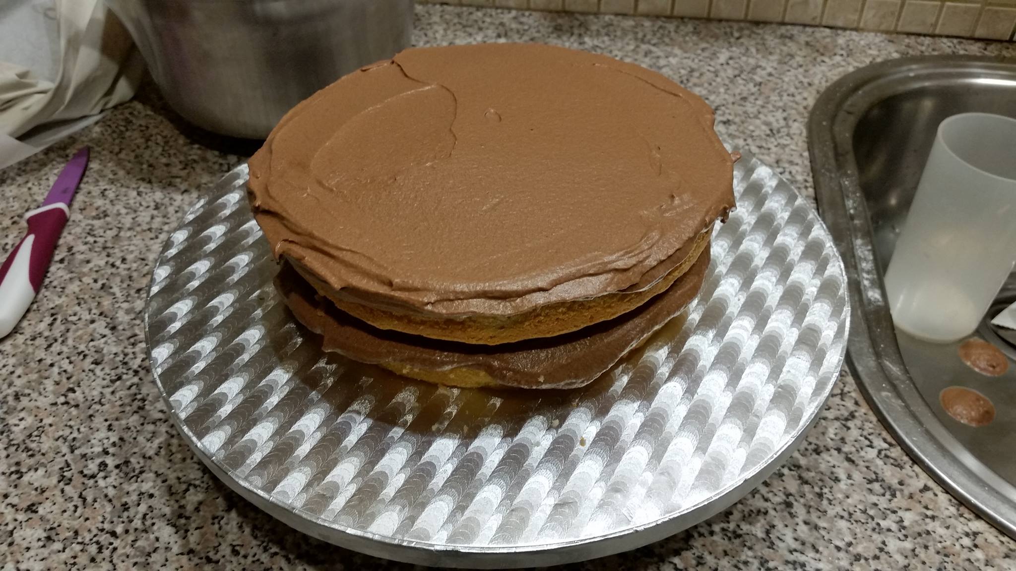 ΤΟ ΤΕΛΙΚΌ ΣΤΆΔΙΟ: Όταν τα κέικ μας έχουν κρυώσει καλά τα κόβουμε οριζόντια σε δίσκους ίδιου πάχους. Σε μια βάση για τούρτα η δίσκο αφού πρώτα βάλουμε στο κέντρο μια κουταλιά της σούπας από την κρέμα μας την οποία απλώνουμε λίγο με το κουτάλι (Αυτό θα βοηθήσει να μην γλιστρήσει το γλυκό μας κατά τη μεταφορά η τη συναρμολόγηση), τοποθετούμε τον πρώτο δίσκο κέικ, τον σιροπιάζουμε με προσοχή και βάζουμε μια στρώση από την κρέμα μας σε πάχος περίπου 1 εκ. Συνεχίζουμε τη διαδικασία παντεσπάνι, σιρόπι, κρέμα μέχρι να τελειώσει το κέικ μας (έβγαλα 4 δίσκους κέικ γιατί δεν τους ήθελα πολύ λεπτούς). Όταν σιροπιάσουμε και τον τελευταίο δίσκο κέικ παίρνουμε 4 καλαμάκια για σουβλάκια η τα ιδικά στηρίγματα για τούρτες και αφού μετρήσουμε, κόβουμε στο κατάλληλο ύψος και τα καρφώνουμε κάθετα και σταυρωτά στο γλυκό μας για να παραμείνει σταθερό. Με την κρέμα η οποία πρέπει να είναι αρκετά ΚΡΎΑ από το ψυγείο καλύπτουμε το γλυκό μας με μια σπάτουλα, και στρώνουμε όσο πιο καλά μπορούμε για να είναι ομοιόμορφο. Αν θέλουμε η κρέμα να είναι τελείως ίσια γύρω και πάνω από το γλυκό και δεν έχουμε τα κατάλληλα εργαλεία τότε μπορούμε να χρησιμοποιήσουμε έναν ίσιο σκληρό χάρακα. Στολίζουμε το γλυκό ανάλογα με της προτιμήσεις μας και το βάζουμε στο ψυγείο να κρυώσει καλά πριν το απολαύσουμε. Καλή επιτυχία και καλή απόλαυση!