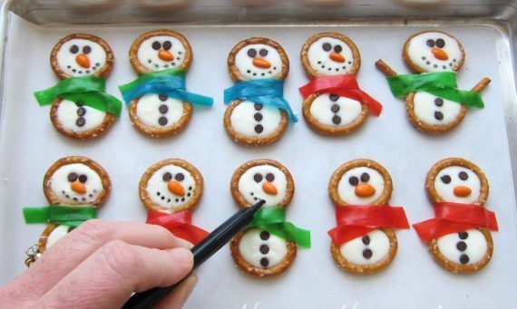 Φτιάχνουμε το frosting και βάζουμε σε ένα ταψάκι λαδόκολα, και με την ζαχαρόπαστα φτιάχνουμε τα κασκόλ των χιονάνθρωπων και επάνω τα pretzels rings.Τα κολάμε με το frosting και γεμίζουμε τα pretzels.