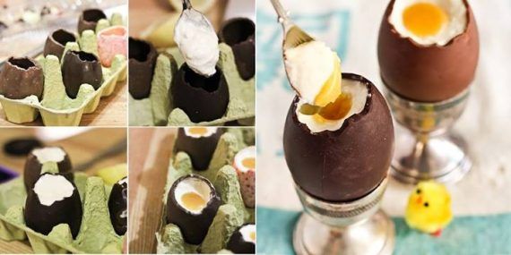 Αφού τα ετοιμάσετε. Όταν παγώσουν,σκάστε τα μπαλόνια και τοποθετήστε τα σε αυγοθήκες και σπάστε λίγο το πάνω μέρος σαν να μοιάζει με σπασμένο τσόφλι.