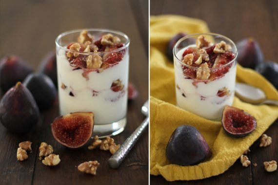 ποτηράκι γεμίζουμε με μία στρώση γιαούρτι, μετά με μια στρώση σύκα και καρύδια