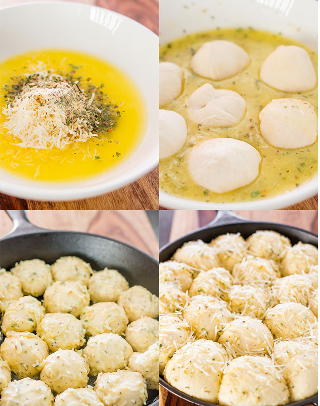 Ξαναζυμώνουμε χωρίζουμε σε 6 μπαλάκια τα αφήνουμε σε αλευρωμένο ταψί τα σκεπάζουμε και τα αφήνουμε σε ζέστη άλλα 40 λεπτά. Λιώνουμε το βούτυρο,ρίχνουμε τα μισά καρυκεύματα μας και το μισό τυρί και βουτάμε μέσα τα ψωμάκια μας προσπαθόντας να τα ανακατέψουμε με τα υλικά ώστε να αγκαλιάσουν τα ψωμάκια. Το ταψάκι μας πρέπει να είναι αντικολητικό για να μην κολήσουν .Προσέξτε να μην τα βάλετε ενωμένα γιατί θα διογκωθούν. Στο τέλος ρίχνουμε από επάνω και τα υπόλοιπα υλικά.