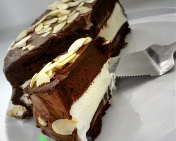 Για την συναρμολόγηση Αφού ψηθεί το κέικ μας το αφήνουμε για 30 λεπτά στο ψυγείο να κρυώσει καλά. Συγχρόνως βγάζουμε το παγωτό από την κατάψυξη και το κόβουμε σε μεγάλα λεπτά τετράγωνα κομμάτια. Όταν κρυώσει καλά το κέικ μας το κόβουμε στη μέση με ένα μαχαίρι για ψωμί. Γεμίζουμε την μια φέτα κέικ με το παγωτό και κλείνουμε από πάνω με την δεύτερη φέτα κέικ. Βάζουμε στην κατάψυξη μέχρι να σερβίρουμε. πηγη