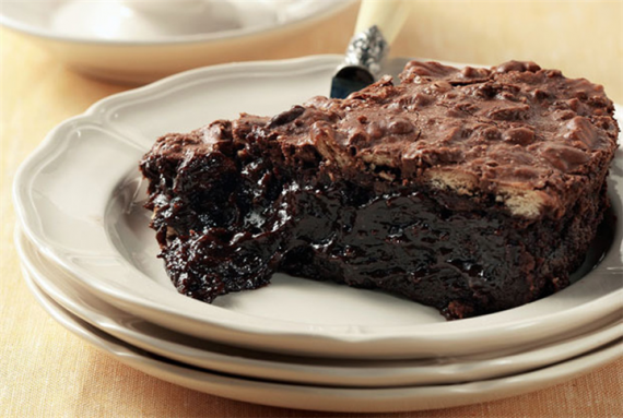 Σε κατσαρόλα λιώνουμε τη σοκολάτα με το βούτυρο σε πολύ χαμηλή φωτιά μέχρι να ομογενοποιηθούν. Με μίξερ χειρός χτυπάμε τα αυγά με τη ζάχαρη για 5΄-6΄ μέχρι να διπλασιαστούν σε όγκο και να γίνουν κρέμα. Ρίχνουμε τη λιωμένη, χλιαρή πλέον, σοκολάτα στο μείγμα αυγών και απαλά ανακατεύουμε να ενωθούν τα δύο μείγματα. Τέλος προσθέτουμε τα σπασμένα μπισκότα κι ανακατεύουμε απαλά με κουτάλι. Βουτυρώνουμε και αλευρώνουμε φόρμα δαχτυλίδι 23 εκ. και αδειάζουμε το μους-κέικ. Ψήνουμε σε προθερμασμένο φούρνο στους 140οC, στον αέρα στη μεσαία σχάρα, για 40΄-45΄, μέχρι να σταθεροποιηθεί το μείγμα και να κάνει σώμα και ελαφριά κρούστα. Αφήνουμε να κρυώσει για 30΄. Το σερβίρουμε χλιαρό (για να τρέχει η σοκολάτα) με χτυπημένη κρέμα γάλακτος στο πλάι και πασπαλίζουμε ξύσμα σοκολάτας. Εάν το αφήσουμε να κρυώσει τελείως, μέσα θα κρατήσει την υγρασία του, αλλά δεν θα τρέχει σοκολάτα.