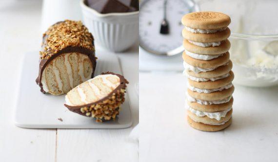 Βουτήξτε κάθε μπισκότο σε λίγο γάλα (όχι ένα πλήρες μούσκεμα, μια ωραία βουτιά). Απλώστε περίπου 1 κουταλιά της σούπας σαντιγύ στη μία πλευρά κάθε μπισκότου και στοίβαξτε τα κάθετα σε ένα μακρύ σχήμα κορμού. Όταν τελειώσετε, τοποθετήστε το σε μια λαδόκολλα.