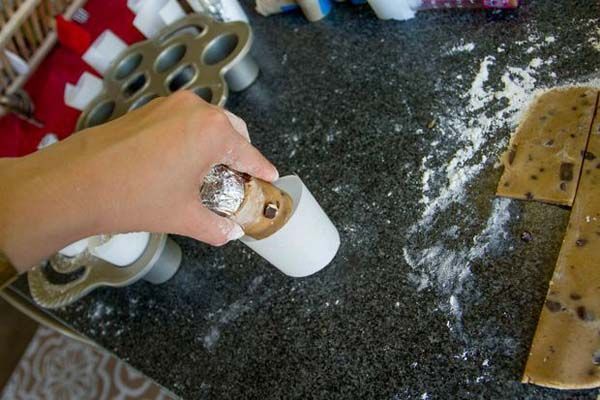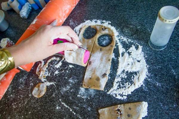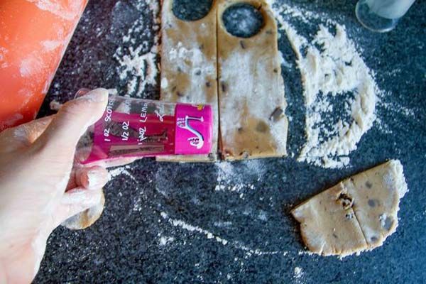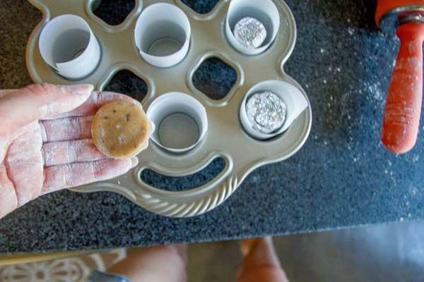 Με ένα μικρό ποτηράκι δίνει σχήμα στη ζύμη.