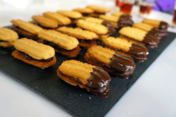 Για τα πτιφούρ: σχηματίστε μικρά στενόμακρα μπισκότα σε ένα ταψί στρωμένο με αντικολλητικό χαρτί. Ψήστε σε προθερμασμένο φούρνο σους 180ο C για 15 λεπτά. Αφήστε τα να κρυώσουν απλώστε μαρμελάδα στο κάτω μέρος από τα μισά μπισκότα και ενώστε τα με τα υπόλοιπα μισά. Βουτήξτε την μία άκρη τους στην λιωμένη κουβερτούρα και αφήστε τα μπισκότα σε αντικολλητικό χαρτί για λίγη ώρα για να στεγνώσει η σοκολάτα