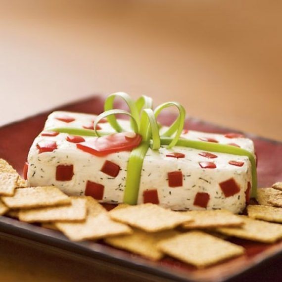Εκτέλεση 1. Σε ένα μπολ, αναμείξτε τον άνηθο, το σκόρδο και το αλάτι με το τυρί κρέμα μέχρι να γίνουν ένα απαλό μείγμα. 2. Καλύψτε ένα ορθογώνιο κουτάκι (μπορείτε να κρατήσετε αυτό του τυριού κρέμα) με πλαστική διαφάνεια και ρίξτε μέσα το μείγμα. 3. Βάλτε το στο ψυγείο τουλάχιστον για 3 ώρες. Πριν το σερβίρετε, βάλτε το παγωμένο κομμάτι τυριού σε μια πιατέλα και διακοσμήστε το με ένα φιόγκο από πράσινο κρεμμυδάκι και τετράγωνα κομματάκια κόκκινης πιπεριάς, σαν πουά περιτύλιγμα.