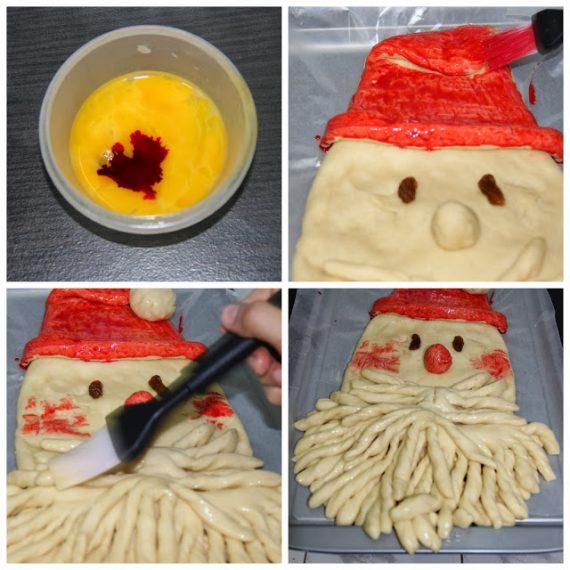 Αφού ξαναφουσκώσει , βάζω τους κρόκους , τον κάθε ένα σε ξεχωριστό μπόλ (ή αν χρησιμοποιήσετε ασπράδια πάλι σε ξεχωριστά μπολ ) . Στο ένα μπολ βάζω 2-3 σταγόνες χρώμα ζαχαροπλαστικής και ανακατεύω μέχρι να γίνει κόκκινο μείγμα και αλείφω την μύτη και τον σκούφο όπως στις εικόνες . Με το άλλο ασπράδι αλείφω το υπόλοιπο μέρος για να πάρει αυτήν την γυαλάδα η ζύμη μας .