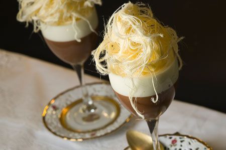 5. Βγάλτε τα ποτήρια με τη σοκολάτα από το ψυγείο, τοποθετήστε τα όρθια και γεμίστε τα με την λευκή κρέμα. Βάλτε τα στο ψυγείο, για 4 ώρες τουλάχιστον, ή ακόμα καλύτερα, για όλο το βράδυ.