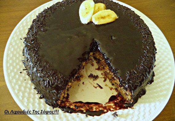 ΥΛΙΚΑ ΓΙΑ ΤΟ ΚΕΙΚ ταψάκι μικρό 20 εκ. 3 ώριμες μπανάνες πολτοποιημένες 100 γρ.μαργαρίνη σε θερμ.δωμ. 1 κούπα (όχι γεμάτη) άχνη ζάχαρη 1 1/2 κούπα αλεύρι που φουσκώνει μόνο του 1 βανίλια 1 πρέζα αλάτι 1/2 κ.γ σόδα 2 κ.σ τρούφα (προαιρετικά) ΥΛΙΚΑ ΓΙΑ ΤΟ ΓΛΑΣΟ ΚΑΚΑΟ 125 γρ.μαργαρίνη 4 κ.σ κακάο 6 κ.σ ζάχαρη 3 κ.σ νερό ΕΚΤΕΛΕΣΗ -Σ’ένα μπολ ανακατεύω για 2-3 λεπτά με αυγοδάρτη τη μαργαρίνη που πρέπει να είναι πολύ μαλακιά,με την άχνη.Προσθέτω το αλάτι,τη βανίλια,τον πολτό μπανάνας,την τρούφα (άν βάλετε) και τέλος με μια σπάτουλα ρίχνω και ανακατεύω απαλά το αλεύρι που το έχω κοσκινήσει με τη σόδα.Δεν παραχτυπάω,απλά ανακατεύω ίσα να ομογενοποιηθούν τα υλικά μου. Αδειάζω το μίγμα σε μικρό ταψάκι 20 εκ.βουτυρωμένο και στρωμένο με λαδόκολα και ψήνω στους 175 αντιστάσεις πάνω κάτω για 25-30 λεπτά περίπου το τσεκάρω με οδοντογλυφίδα για να μην παραψηθει και στεγνώσει!! Το αφήνω να κρυώσει λίγο και το αναποδογυρίζω σε πιατέλα. Για το γλασο βάζω όλα τα υλικά σε ένα κατσαρολάκι και σε χαμηλή φωτιά τα ανακατεύω συνέχεια μεχρι να λιώσουν και να γυαλίσει το μίγμα.Άν σας κάνει”σβολάκια”το μίγμα,περάστε το από ένα σουρωτήρι!Όσο κρυώνει το γλάσο πήζει.όταν κρυώσει περιχύνω το κέικ μου.Είναι καταπληκτικό!!!!!!!