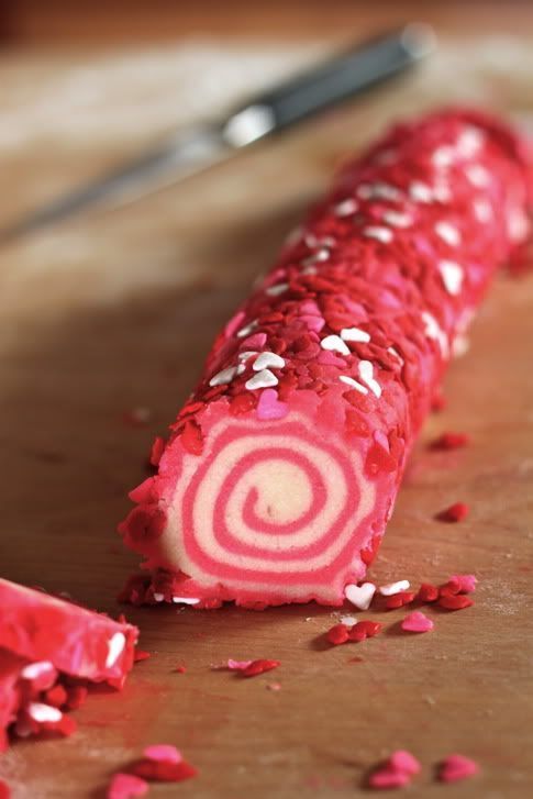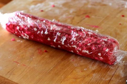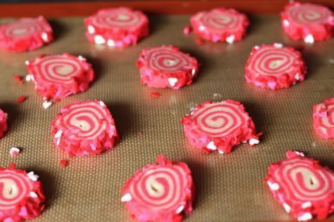 Ανάμειξε τη ζάχαρη με το ροζ χρώμα η τα καραμελακια περνα τη ζυμη με ενα πινελο και νερο να κολλησουν τα καραμελακια(αν βαλεις ροζ ζαχαρη θα τη βαλεις στο τελος μολις ψηθουν τα μπισκοτακια)