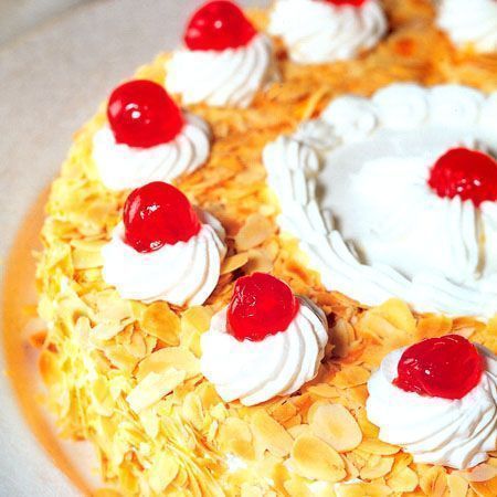 8. Κολλάμε αμυγδαλάκια γύρω-γύρω στο κάτω μέρος της τούρτας για να τη διακοσμήσουμε. Βάζουμε σε κορνέ σακούλα ζαχαροπλαστικής με μυτούλα οδοντωτή την υπόλοιπη σαντιγί και διακοσμούμε την τούρτα με ροζέτες σαντιγί και λίγα αμυγδαλάκια γύρω από κάθε ροζέτα. Τελειώνουμε τοποθετώντας ένα κερασάκι γλασέ, ή ένα φρουτάκι, πάνω σε κάθε ροζέτα.