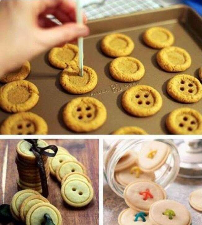 Αφού περάσουν οι 2 ώρες αφαιρούμε τη ζύμη από το ψυγείο και την κόβουμε στη μέση ώστε να έχουμε 2 μπάλες. Σε μια ελαφρώς αλευρωμένη επιφάνεια, ανοίγουμε την κάθε μπάλα ζύμης σε 1 εκ πάχος φύλλο. Κόψτε με ένα στρογγυλό κουπ πατ μπισκότων αφού το βουτήξτε πρώτα σε αλεύρι. Τοποθετήστε κάθε μπισκότο σε ταψί με λαδόκολλα. Με ένα μικρότερο κουπ πατ πατήστε ελαφρά τα μπισκότα ώστε να σχηματίσει το σχήμα του “κουμπιού”. Στη συνέχεια με ένα ξύλινο καλαμάκι ανοίγετε 2 τρύπες στη μέση του μπισκότου τη μια δίπλα στην άλλη. Ψήνουμε στους 160 ° C για 10-15 λεπτά. Στη συνέχεια αφήνουμε να κρυώσουν καλά και διακοσμήστε με μια λεπτή κόκκινη κορδέλα περνώντας τη ανάμεσα από τα μπισκότα.