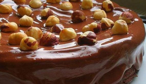 - Όταν λειώσει η σοκολάτα, χτυπάμε το μείγμα, μέχρι να αφρατέψει και να γίνει χλιαρό. Στη συνέχεια, ξεφορμάρουμε το κέικ στην πιατέλα μας, το περιχύνουμε με το γκλάσο και το στολίζουμε με τα καβουρντισμένα φουντούκια. [Κρατάμε και κάποια φουντούκια ολόκληρα για διακόσμηση]