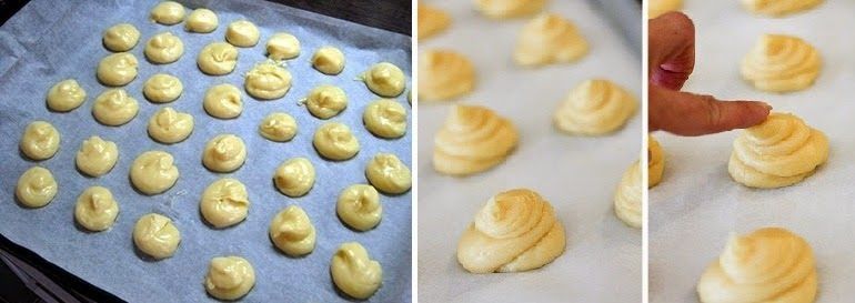 3. Αφήνουμε να κρυώσει η ζύμη, και την βάζουμε σε σακούλα του κορνέ με φαρδιά ίσια μύτη, και πάνω σε λαμαρίνα την οποία έχουμε στρώσει με χαρτί ψησίματος, φτιάχνουμε «μπαλίτσες» σαν μεγάλο καρύδι,(όπως στη φώτο), αφήνοντας 3-4 εκ. κενό μεταξύ τους, διότι θα φουσκώσουν.