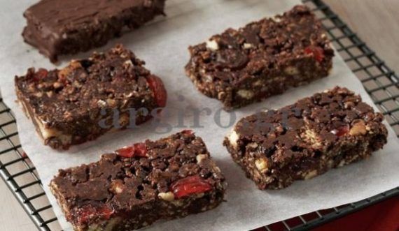 Τοποθετούμεσε μπεν μαρί τη σοκολάτα με το βούτυρο σε χαμηλή φωτιά μέχρι να λιώσουν. Αποσύρουμε από τη φωτιά. Προσθέτουμε το ρούμι και το μέλι. Σπάμε τα πτι μπερ σε μικρά κομμάτια με τα χέρια (όχι στο μπλέντερ) και τα προσθέτουμε στο μείγμα. Προσθέτουμε τις νιφάδες ρυζιού, τα κερασάκια και τα καρύδια. Ανακατεύουμε πολύ καλά με κουτάλι, να αναμειχθούν τα υλικά. Στρώνουμε λαδόκολλα σε πυρίμαχο σκεύος ή μακρόστενο ταψί. Αδειάζουμε το μείγμα και με το κουτάλι ισιώνουμε την επιφάνειά του. Παγώνουμε για 2 ώρες στο ψυγείο. Γυρνάμε σε δίσκο ή ξύλο κοπής το γλυκό. Αφαιρούμε τη λαδόκολλα και κόβουμε τις γκοφρέτες σε μικρά μακρόστενα κομμάτια. Βουτάμε κάθε γκοφρέτα στη ζεστή λιωμένη κουβερτούρα και αφήνουμε σε λαδόκολλα να κρυώσει και να σκληρύνει η επικάλυψη σοκολάτας.