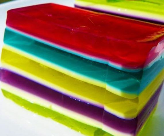 (Τα πακέτα ζελέ π.χ. φράουλα, λεμόνι κλπ Τα έτοιμα ζελέ π.χ. Γιώτης δεν έχουν πολλά χρώματα. Έτσι καλύτερα να πάρουμε πακέτα σε σκόνη διάφορα χρώματα και να το φτιάξουμε με ζελατίνη όπως λέει η συνταγή ή στα έτοιμα να ρίξουμε χρώμα ζαχαροπλαστικής και να πετύχουμε μπλε, μωβ και λοιπά)