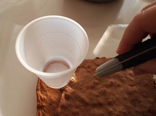 Προθερμαίνουμε τον φούρνο μας στους 200 βαθμούς κελσίου. Λιώνουμε το βούτυρο σε πολύ χαμηλή φωτιά (να λιώσει αλλά να μην μαυρίσει και ανακατεύουμε μέσα το κακάο. Σε ενα μπολ ανακατεύουμε το αλεύρι με το baking powder και το αλάτι. Χτυπάμε στο μίξερ τα αυγά με την ζάχαρη μέχρι να πάρουν ένα ανοιχτό κίτρινο χρώμα και στην συνέχεια προσθέτουμε την βανίλια και τέλος το μείγμα με το αλεύρι. Μόλις ανακατευτούν καλά τα υλικά προσθέτουμε το βούτυρο με το κακάο. Στρώνουμε ενα ταψάκι με αντικολλητικό χαρτί να προεξέχει λίγο στις άκρες. Αδειάζουμε το μείγμα και ψήνουμε για 15 – 20 λεπτά. Χαμηλώνουμε τον φούρνο στους 120 βαθμούς και συνεχίζουμε το ψήσιμο για 10 λεπτά ακόμη. Βγάζουμε το ταψί απο τον φούρνο, το αφήνουμε 5 λεπτά μέσα στο ταψί και στην συνέχεια το αναποδογυρίζουμε σε σχάρα. Αφού κρυώσει τελίως, παίρνουμε πλαστικά ή χάρτινα ποτηράκια και αρχίζουμε και κόβουμε δίσκους μικρούς για την βάση του ποτηριού