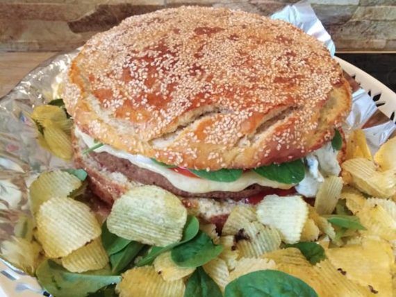 Συνταγή για γίγας burger 30 εκατοστών με σπιτικό αφράτο μπιφτέκι και γέμιση με ό,τι υλικά μας αρέσουν και υπάρχουν στο ψυγείο μας. Νόστιμο burger σε καρβέλι για ένα πρωτότυπο ορεκτικό σε μπουφέ και τραπέζια. Δοκιμάστε το!