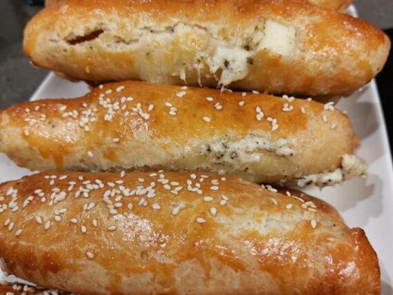 Έπειτα σε ένα άλλο μπολ ανακατεύουμε το χαλούμι, το κίτρινο τυρί και τον δυόσμο. Παίρνουμε ένα κομμάτι ζύμης σε μέγεθος μεγάλου μανταρινιού και το ανοίγουμε ελαφρώς σε οβάλ σχήμα με τον πλάστη. Βάζουμε 2 κουταλιές της σούπας από την γέμιση και τυλίγουμε.