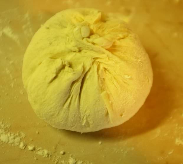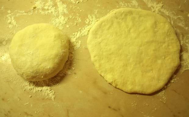 Χωρίζουμε το ζυμάρι σε μπαλίτσες και ανοίγουμε καθεμία σε έναν λεπτό δίσκο.