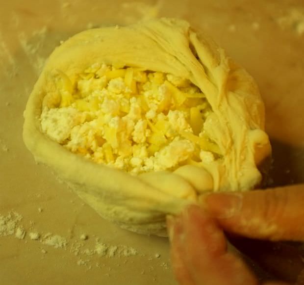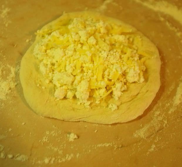 Τοποθετούμε το μίγμα των τυριών επάνω στον δίσκο της ζύμης και τυλίγουμε.
