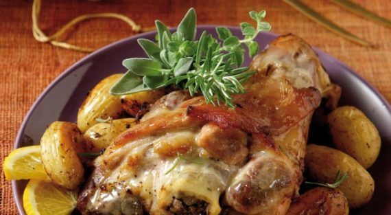 Μαριναρισμένο χοιρινό κότσι με μελωμένες πατατούλες στη γάστρα.