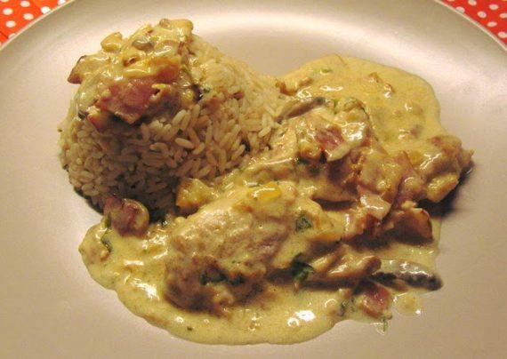 Το βγαζουμε απο το τηγανι…Μεσα στο ιδιο λαδι τσιγαριζουμε το κρεμμυδι μαζι με το μπεικον και τα μανιταρια,ριχνουμε και τα φιλετακια μας μεσα,σβηνουμε με το κρασι,μολις εξατμιστει τελειος το κρασι ριχνουμε τον μαιντανο το αλατι το πιπερι και προσθετουμε την κρεμα γαλακτος βραζουμε μονο πεντε λεπτα μεχρι η κρεμα να γινει ενα χρωμα μπεζ..σερβιρουμε με ρυζι…