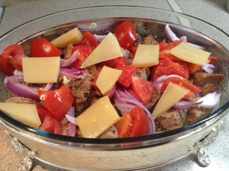 Βάζουμε το κρέας σε ενα πυρέξ ρίχνουμε ντοματίνια η ντομάτες κομμένες σε κομμάτια πιπεριές κίτρινα τυριά κομμένα σε κομμάτια,ενα κρεμμύδι κομμένο σε φέτες και μια σκελίδα σκόρδο ψιλοκομμένη.