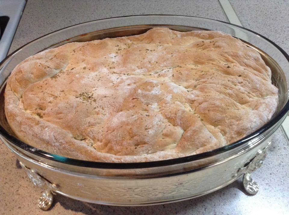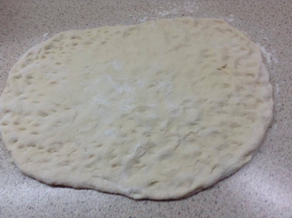 Σε αλευρωμενο παγκο ανοιγουμε το ζυμάρι μας πατώντας με τα χερια στο μέγεθος που ειναι το πυρέξ μας.