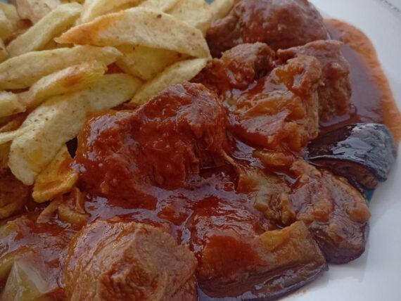 Εκτέλεση για το χοιρινό κοκκινιστό με μελιτζάνες και πιπεριές