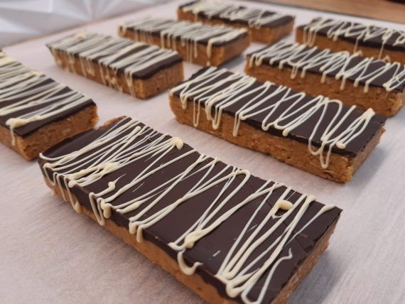 Δείτε παρακάτω την εκτέλεση για τις χορταστικές μπάρες φυστικοβούτυρου με επικάλυψη σοκολάτας: