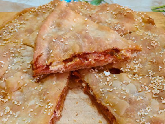 Τη ζύμη που προεξέχει από το ταψί την παίρνουμε την πλάθουμε σε μπάλα και ανοίγουμε άλλα δύο μικρότερα φύλλα τα οποία τα απλώνουμε από πάνω λαδωμένα μεταξύ τους. Πασπαλίζουμε με σουσάμι. Ψήνουμε στους 180 βαθμούς Κελσίου, στον αέρα μέχρι να ροδίσει.