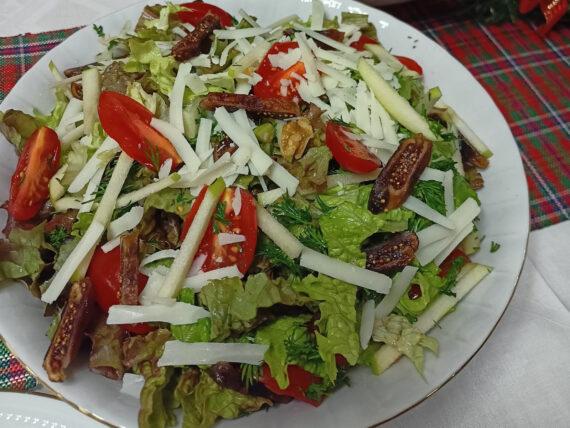 Αρχικά χοντροκόβουμε το μαρούλι και την ρόκα και τα βάζουμε σε ένα μπολ. Προσθέτουμε τον ψιλοκομμένο άνηθο, το ξινόμηλο κομμένο σε κύβους, τα καρύδια χοντροκομμένα, τα αποξηραμένα σύκα, τα ντοματίνια κομμένα στην μέσα και την γραβιέρα κομμένη σε λεπτές λωρίδες. Ανακατεύουμε.