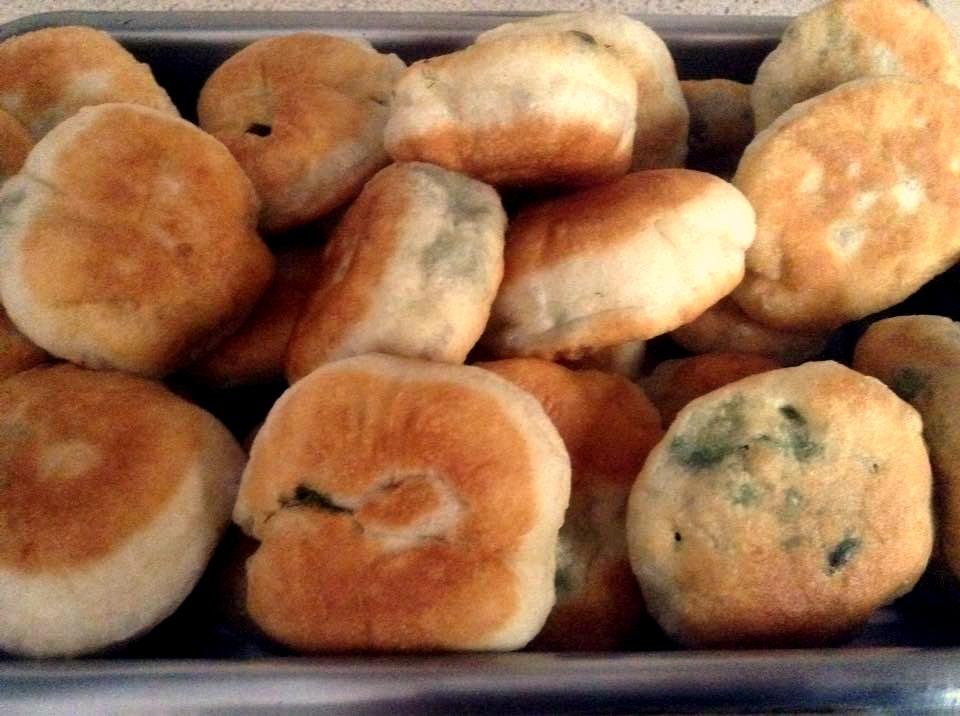 Ζυμώνουμε και την αφήνουμε σε ζεστό μέρος να φουσκώσει. Σε ένα πιάτο ψιλοκόβουμε ένα ματσάκι άνηθο φρέσκα κρεμμυδάκια μαζί με το πράσινο μέρος τους και αλατίζουμε. Κόβουμε κομμάτια από το ζυμάρι μας σε αλευρωμένο πάγκο ανοίγουμε σε πιτάκι βάζουμε στη μέση ένα κουταλάκι από τη γέμιση το κλείνουμε κάνοντας μπαλάκι το πατάμε ανάμεσα στα χέρια μας να το κάνουμε πιτάκι και τηγανίζουμε!
