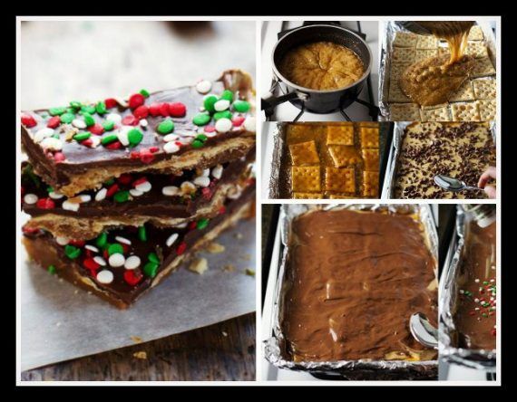 1 κούπα μαύρης ζάχαρης 1 κούπα αλατισμένο βούτυρο 1 συσκευασία τετράγωνα κράκερς 3/4 φλιτζανιού φυστικοβούτυρου 2 φλιτζάνια τσιπς σοκολάτας Χρωματιστή τρούφα κατά προτίμηση κόκκινη και πράσινη Για να το φτιάξεις:
