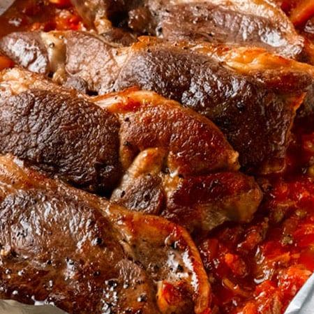 5. Ακουμπάμε πάνω από την ντομάτα, τις μπριζόλες με σειρά. Περιχύνουμε τις μπριζόλες, με την υπόλοιπη ντομάτα.