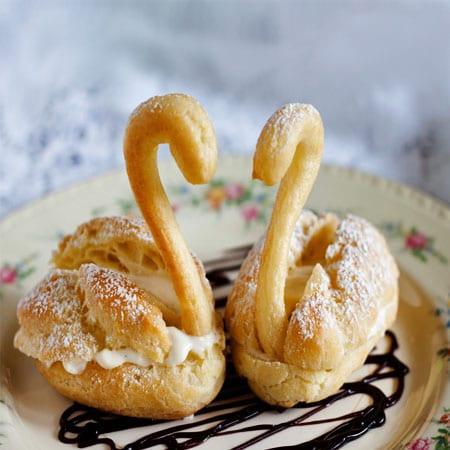 6. Στολίζουμε τους κύκνους στην πιατέλα μας και τους χιονίζουμε με ζάχαρη άχνη.