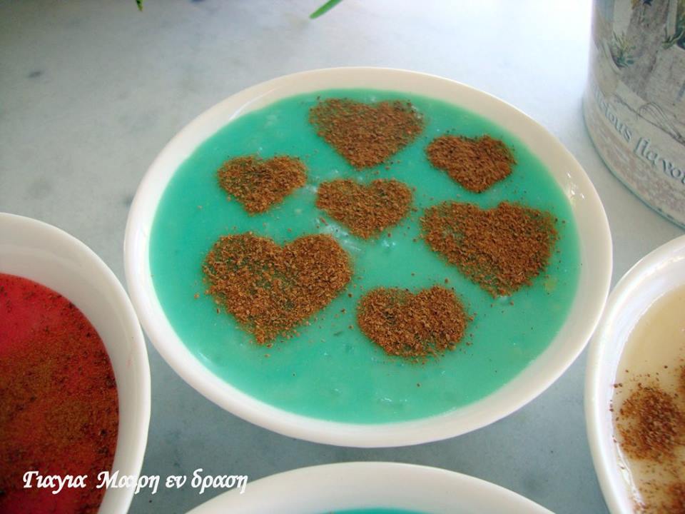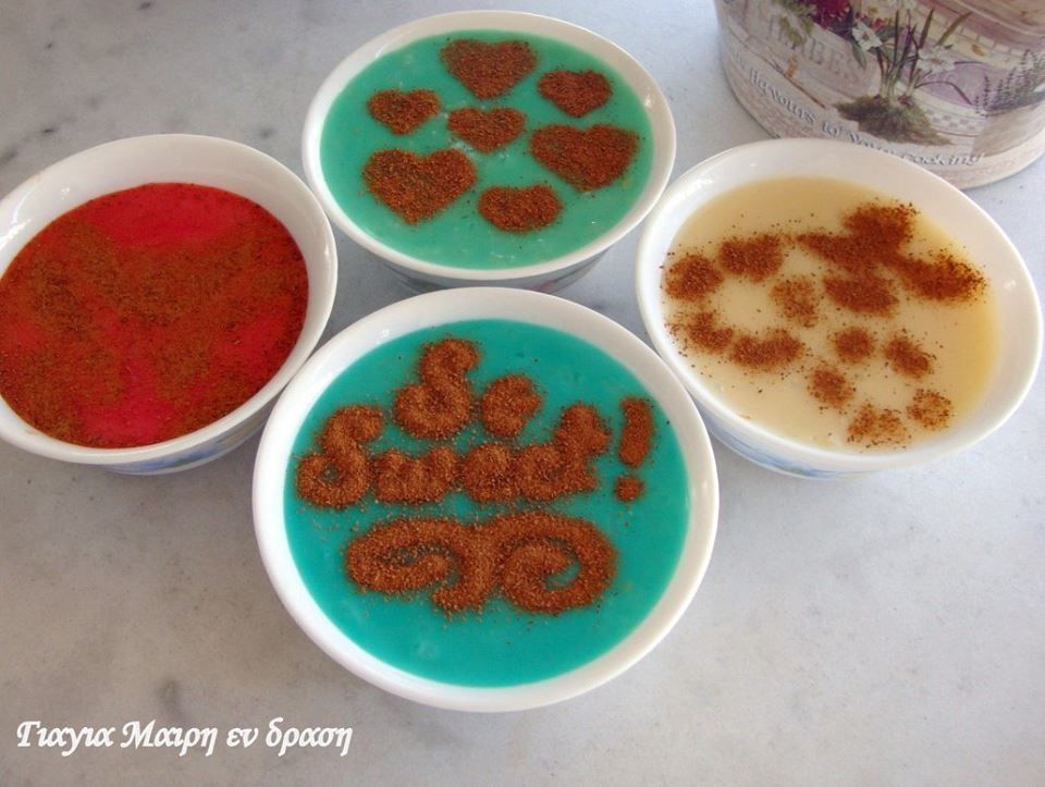 Μια ιδέα να κάνετε τα παιδάκια να φάνε ρυζόγαλο,Χρωματιστο ριζογαλό για παιδια! υλικά 2 ποτήρια νερό 3/4 ποτηριού ρύζι γλασέ μια πρέζα αλατι 2 ποτήρια φρέσκο γάλα 5-6 κουταλιές ζάχαρη 2 κουταλιές άνθος αραβοσίτου η’ κορν φλάουρ ξύσμα από 1 πορτοκάλι 2 κουταλιές μέλι φυτικό χρώμα ζαχαροπλαστικής εκτέλεση Πλένουμε καλά το ρύζι και το βάζουμε στην κατσαρόλα με το νεράκι και όταν έχει βράσει πολύ καλά και έχει εξατμιστεί αρκετό νεράκι βάζουμε τα υπόλοιπα υλικά. Ανακατεύουμε συνέχεια να μην κολλήσει!!! Αν δεν σας πήζει μπορείτε να βάλετε σε ένα φλιτζανάκι γάλα ακόμα μια κουταλιά κορν φλάουρ!!! ¨Οταν είναι έτοιμο σαν κρέμα βγάζετε ένα ένα μπολάκι ρυζόγαλο και ρίχνετε μερικές σταγονες χρώμα ζαχαροπλαστικής!!! Μόλις κρυώσει βάζετε λίγη κανελιτσα και καλή σας όρεξη!!!