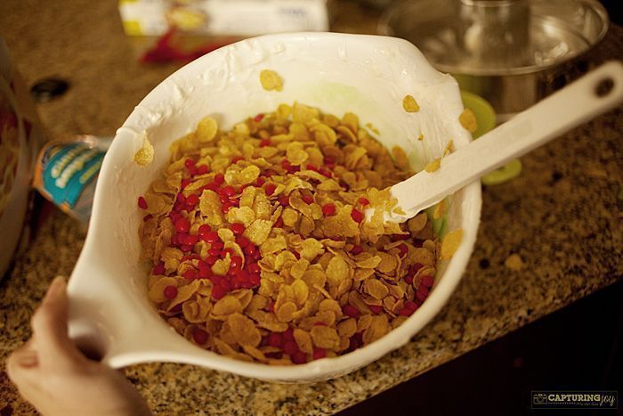 Μόλις λιώσουν προσθέτουμε το πράσινο χρωμα τροφίμων προαιρετικά. Βάζουμε τις νιφάδες καλαμποκιού στο μείγμα με κόκκινο προσθέτουμε τα m&m και ανακατεύουμε καλά. Απλώστε σε μια λαδωμένη φόρμα
