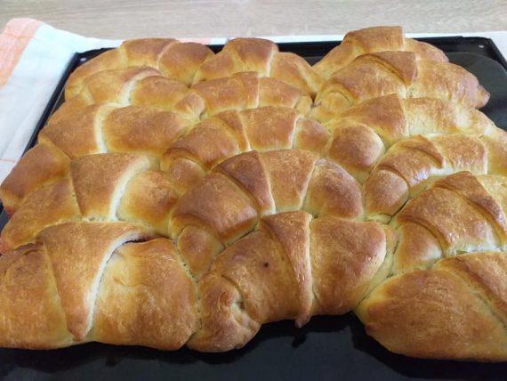 Σχηματίζουμε με τα τριγωνάκια, τα κρουασανάκια μας και τα τοποθετούμε σε ταψί με λαδόκολλα το ένα δίπλα στο άλλο.
