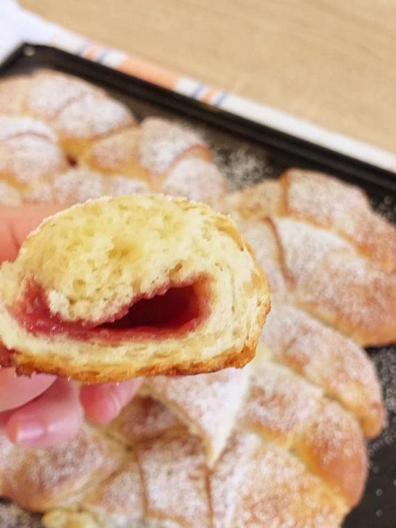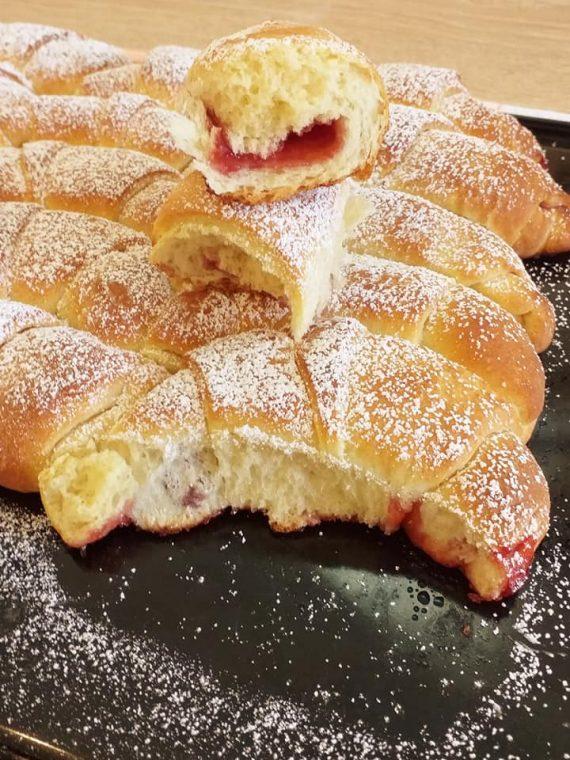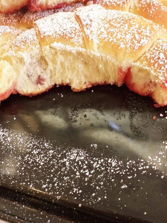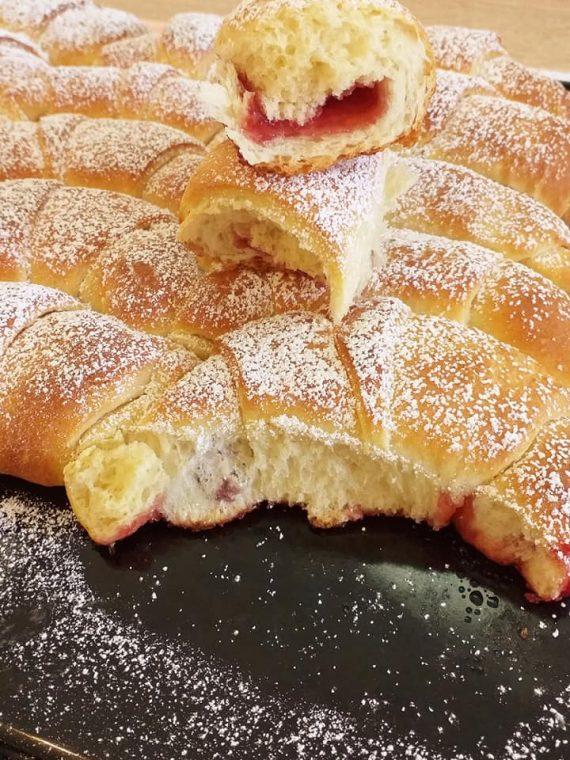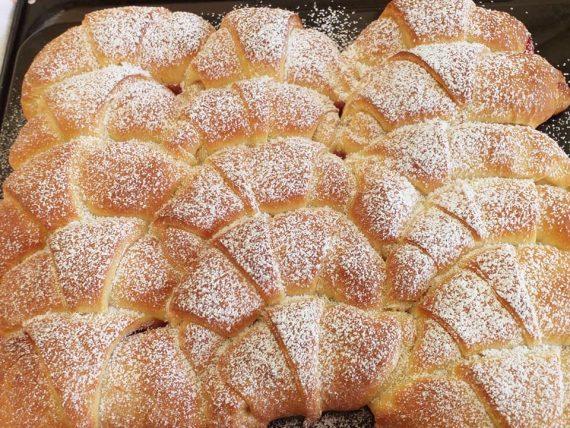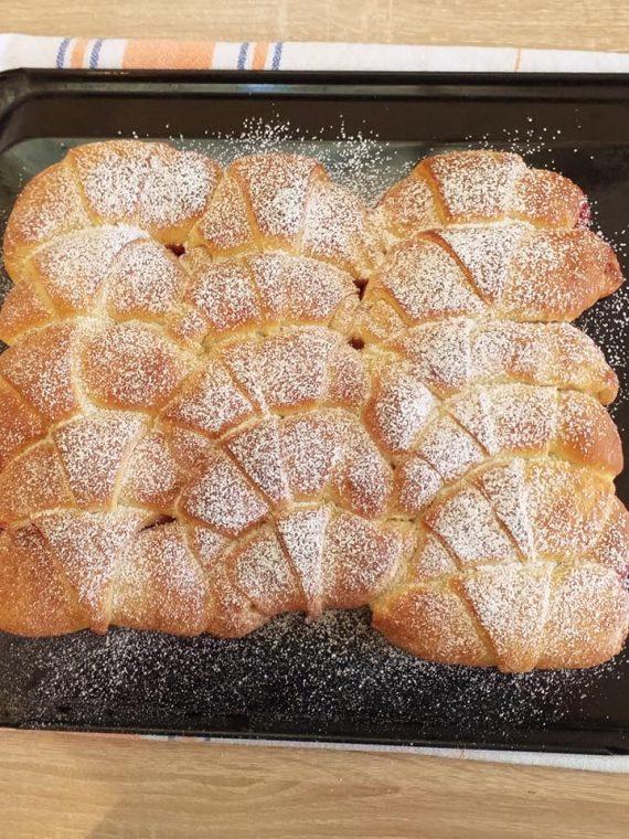 Όταν τα τοποθετήσουμε στο ταψί με την λαδόκολλα, τα σκεπάζουμε με μια πετσέτα και τα αφήνουμε να φουσκώσουν για 20 λεπτά ακόμη. Τα αλείφουμε με γάλα, χρησιμοποιώντας ένα πινέλο και τα ψήνουμε στους 180 βαθμούς Κελσίου για 20 λεπτά. Αφού τα αφήσουμε να κρυώσουν για λίγο τα πασπαλίζουμε με ζάχαρη άχνη.