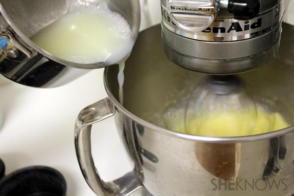 Βράζουμε ένα φλιτζάνι γάλα. Σε ένα μίξερ, χτυπάμε τα αυγά και τη ζάχαρη.