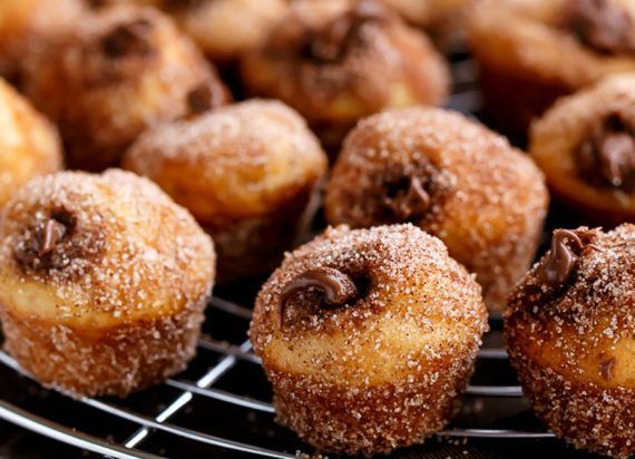Προθερμαίνουμε τον φούρνο στους 176°C. Ψεκάζουμε μία φόρμα με 24 θήκες για μίνι muffins με μαγειρικό σπρέι. Την αφήνουμε στην άκρη. Σε ένα μεγάλο μπολ, χτυπάμε ελαφρά όλα τα ξηρά συστατικά μαζί. Κάνουμε ένα φρεάτιο στο κέντρο και προσθέτουμε το λάδι, το αυγό, τη βανίλια και το γάλα. Χτυπάμε το μείγμα μέχρι να γίνει λείο και χωρίς σβώλους. Γεμίζουμε κάθε θήκη με 2 κουταλάκια του γλυκού από το μείγμα, γεμίζοντας τις μέχρι τα ¾. Ψήνουμε για 10-15 λεπτά ή έως ότου ροδίσουν και η οδοντογλυφίδα βγαίνει καθαρή όταν τα τρυπάμε στο κέντρο με αυτήν. Τα αφήνουμε να κρυώσουν για 5 λεπτά και τα μεταφέρουμε σε μια σχάρα. Αλείφουμε κάθε ντόνατς με ένα ελαφρύ στρώμα λιωμένου βουτύρου. Ανακατεύουμε τη ζάχαρη και την κανέλα μαζί σε ένα ρηχό μπολ. Κυλάμε κάθε ντόνατς στο μείγμα ζάχαρης και κανέλας μέχρι να επικαλυφθούν ομοιόμορφα. Γεμίζουμε ένα κορνέ ζαχαροπλαστικής με τη Nutella. Χρησιμοποιώντας ένα στενό ακροφύσιο, γεμίζουμε κάθε ντόνατς με τη Nutella μέχρι να φουσκώσουν (όχι πάρα πολύ αλλιώς τα ντόνατς θα ξεχειλίσουν).