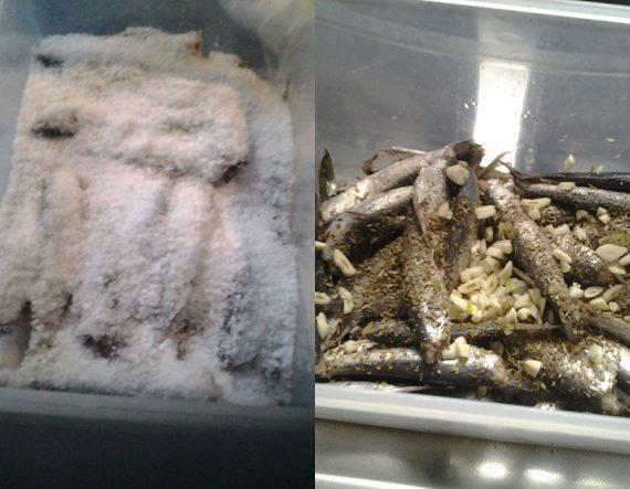 Τα ξεπλένουμε καλά για να φύγει το αλάτι και τα βάζουμε πάλι στο ξεπλυμένο από αλάτι τάπερ. Τα σκεπάζουμε με ξύδι. Την άλλη μέρα στραγγίζουμε τα ψάρια από το ξύδι και βάζουμε ρίγανη, ψιλοκομμένο σκόρδο και λίγο φρέσκο ξύδι. Καλύπτουμε τα ψάρια με σπορέλαιο.